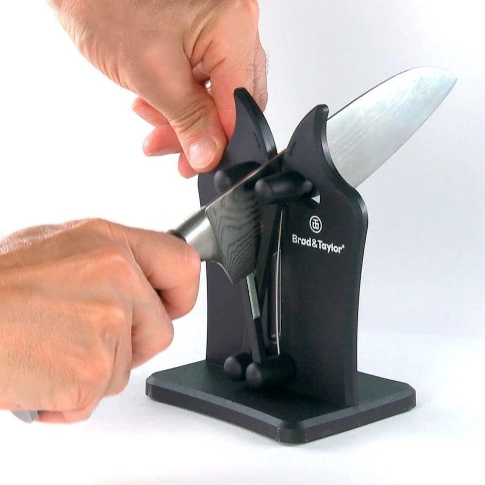 Are your kitchen knives dulling from long-term use? Brod & Taylor’s Classic Knife Sharpener will give you that perfect edge once again. Sharpen standard, serrated, and even Japanese knives with Brod & Taylor’s Professional Knife Sharpener. Only half the price of the original Professional Knife Sharpener, the Classic is made from PA 66 nylon and uses the same radically advanced sharpening technique borrowed from high-tech CNC metal machining: its spring-action sharpening bars automatically accommodate any knife’s shape. For best results, polish and hone your blade daily. The knife sharpener’s ultra-hard tungsten carbide surfaces will sharpen, hone, and polish your blades efficiently without removing metal. If you need directions on what kind of technique to use for sharpening, just look under the base to find instructions on how to fine sharpen, coarse sharpen, or hone on serrated-edged blades. Now you can effortlessly slice or dice your carrots and cucumbers for years to come. Avoid the mess and hassle of dull blades by keeping your knives sharp and shining with Brod & Taylor’s Classic Knife Sharpener.