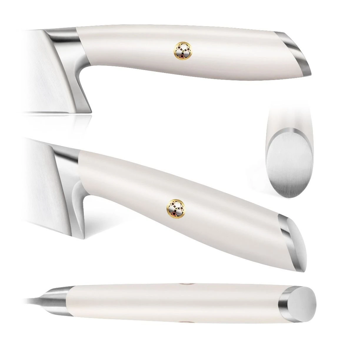 Uncompromising quality combines with cutting edge design in the L1 Series Knife Block Set from Cangshan Cutlery. The full tang blades are forged from tight-grained German Steel for incredible durability and edge-retention. With sleek lines and blunted ends, the handles’ white minimalist aesthetic is accented by a single mosaic-style rivet for a subtle flair of artful sophistication. The patent-pending design focuses on the uniquely tapered tang, which ensures comfortable, precise cutting. This set includes three of the most-used knives for food preparation: a chef’s knife, serrated utility knife and a paring knife. The 3 pieces fit into the luxuriously handcrafted acacia wood block, adding rich warmth to your countertop. For a design that masterfully blends functionality with sophistication, order your Cangshan Cutlery L1 Series Knife Block Set today.