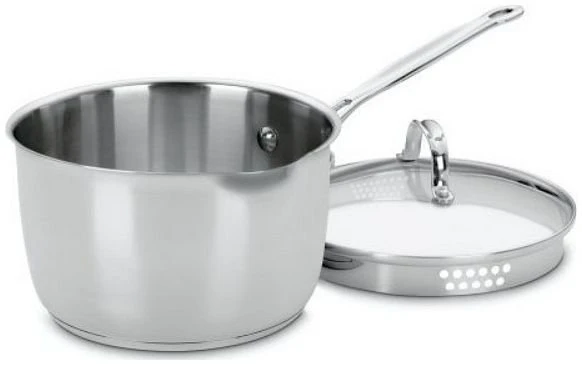 Easily drain vegetables, noodles, and much more with the easy “cook and pour” feature; this Cuisinart Saucepan’s lid doubles as a strainer. Two different sized draining holes allow you maximum control. This stainless Cuisinart Saucepan is dishwasher safe for easy cleaning. This high-quality Stainless Steel Cuisinart Saucepan is backed up by a lifetime warranty.