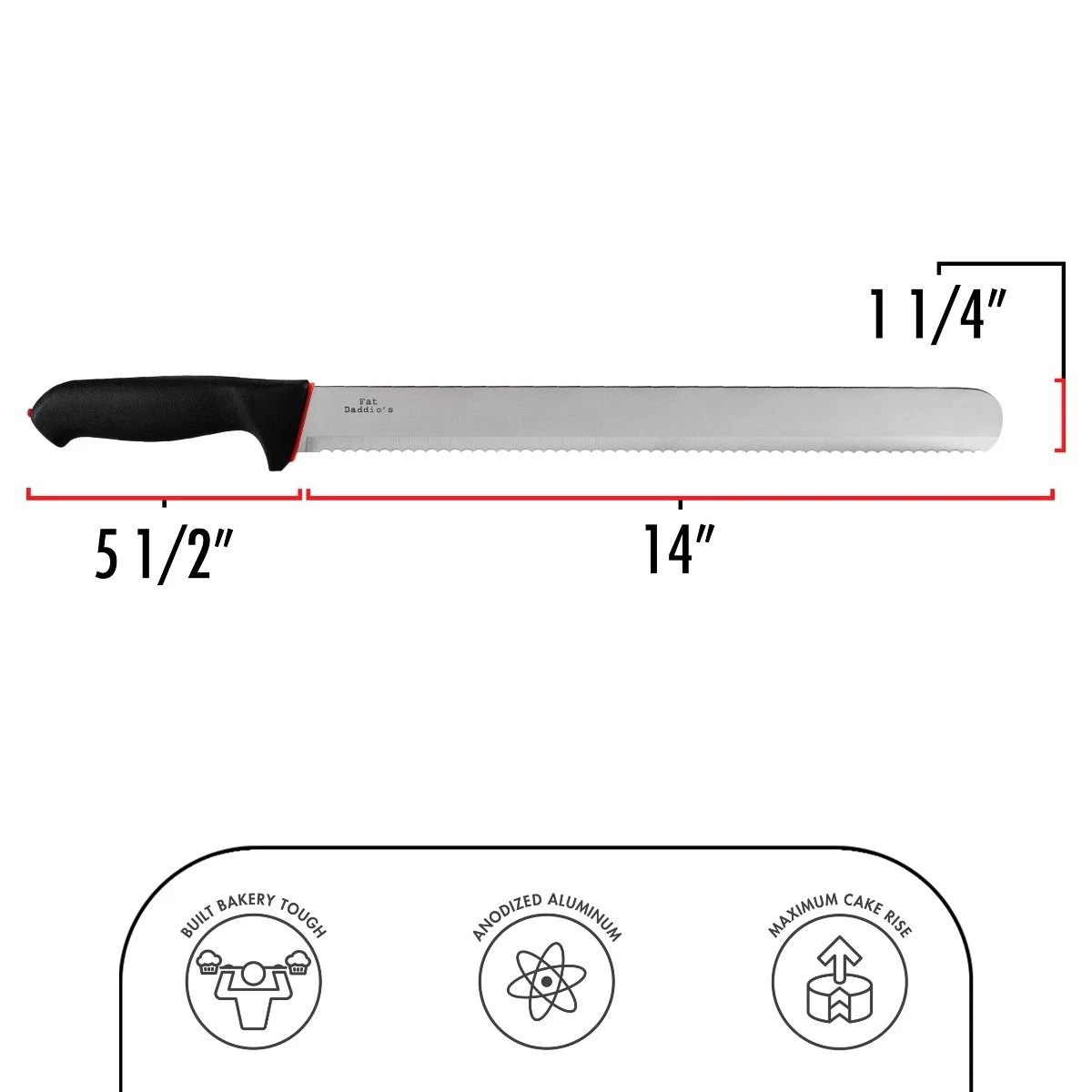 From hearty breads to fragile cakes the Fat Daddios Cake Slicer/Bread Knife is your go to knife. Made of 16 gauge stainless steel with serrated blades and a comfort grip handle. You have quality craftmanship you can come to expect from Fat Daddios.
