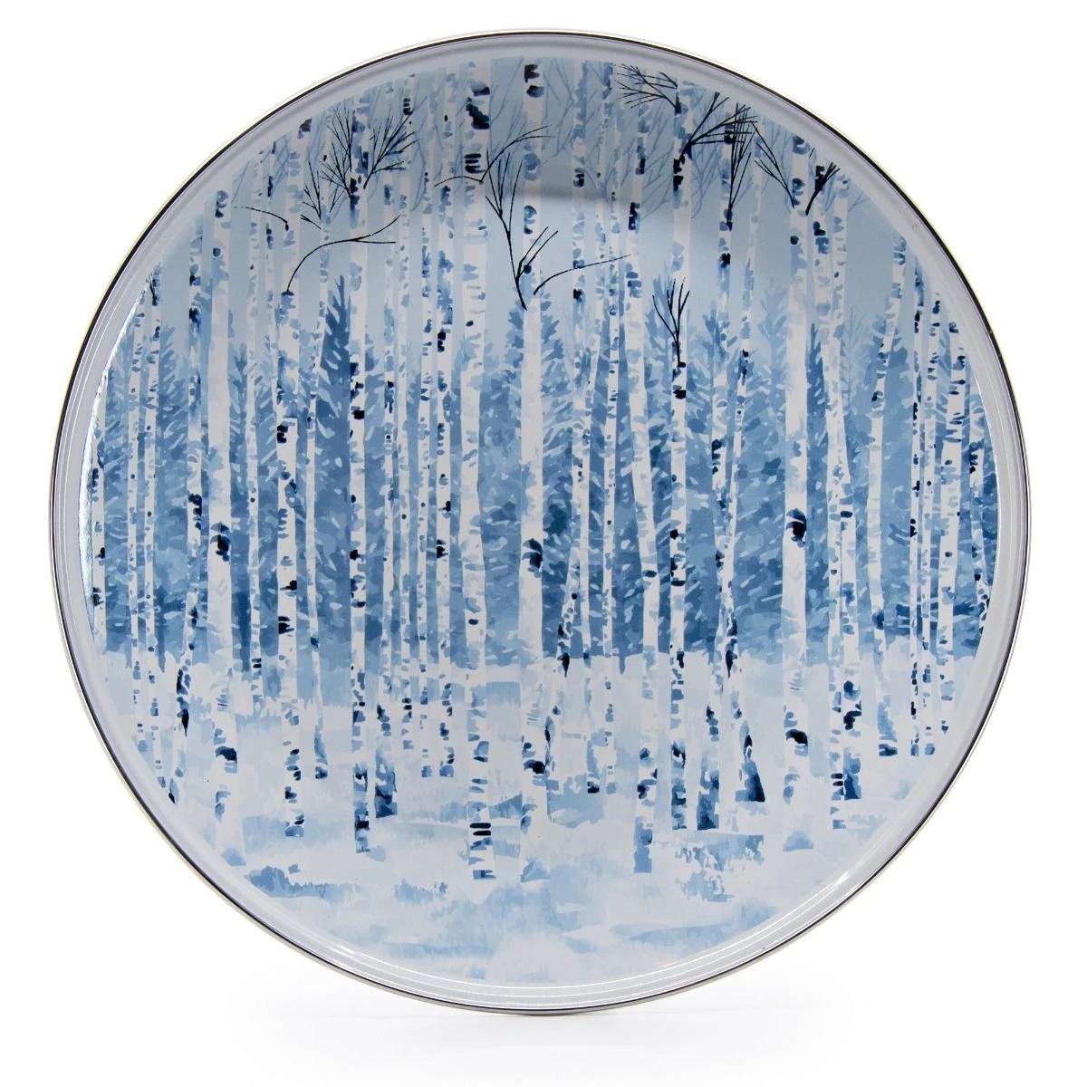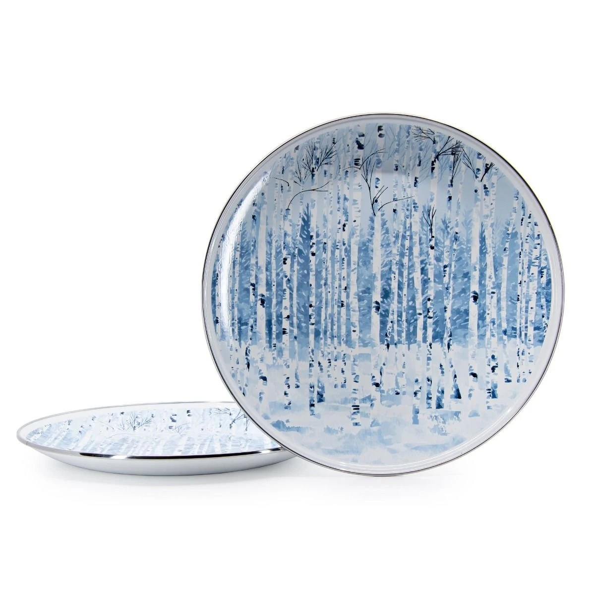 Enchant your guests with a wintery and woodsy appeal at your next dinner party with the Golden Rabbit Enamelware 12.5″ Charger Plate Set of 2 in Aspen Grove. Made from carbon steel coated with porcelain enamel with a stainless steel rim, these Charger Plates are intended to set the tabletop for more formal events like weddings or graduation meals. Charger plates are set underneath the salad/appetizer and dinner plates to catch drips and spills from what is eaten during a full-course meal. These Charger Plates feature a charming yet picturesque scene of aspens lined up in a snowy forest. This piece will look delightful on any table with other plates set accordingly with its style and design, inspiring a calmer mood for all those who marvel at it. Variations in color shading and pattern formation will occur from its hand-dipped process. This plate is also oven/stovetop-safe and non-toxic. Do not use this bowl in the microwave. When you are done using this Charger Plate, it is fine to wash in the dishwasher. For a decorative plate that’ll grant whimsy and peace, the Golden Rabbit Enamelware 12.5″ Charger Plate in Aspen Grove is the plate to own.