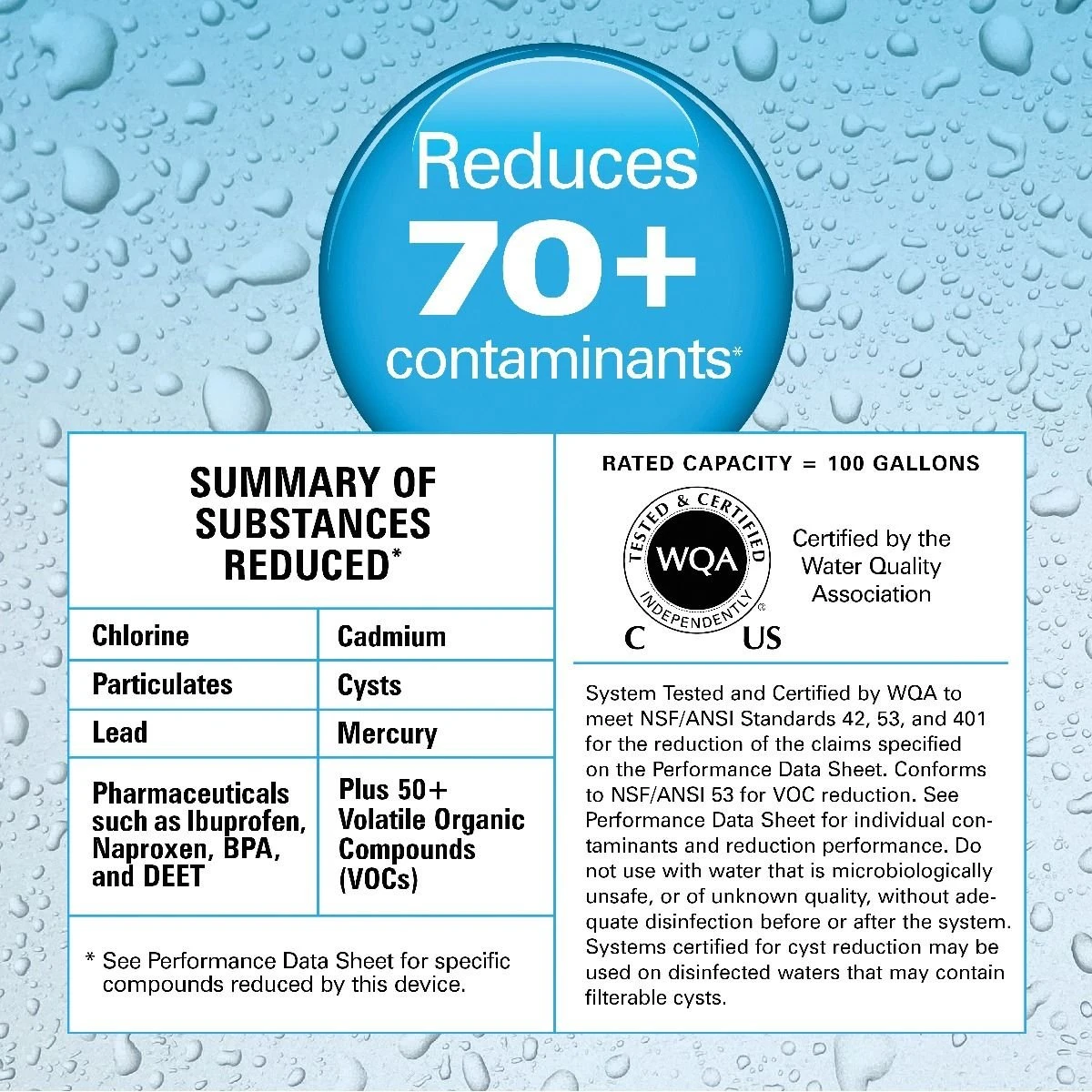 - Reduces lead, chlorine, mercury, pharmaceuticals, and over 50 volatile organic compounds found in tap water