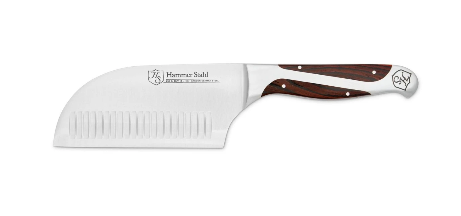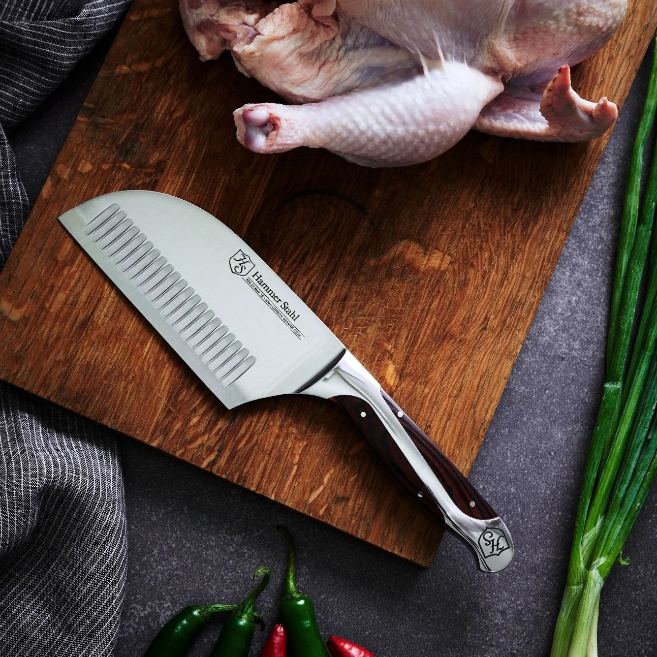 Easily slice carrots, potatoes, and other hard vegetables with Hammer Stahl’s 5” Cleaver. Like all Hammer Stahl cutlery, this small but heavy-duty knife is made of durable, high-carbon German stainless steel. It’s tempered to a Rockwell hardness of 55-57 for superior edge and lasting durability. The ultra-sharp blade is hollow ground which prevents ingredients from sticking to the knife as you cut.