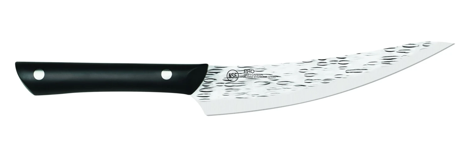 NSF-certified for use in commercial kitchens, Kai PRO knives are made of Japanese AUS6M high-carbon stainless steel and hand sharpened to a 16° edge on each side. Full-tang with a double-riveted handle, the PRO series knives are built to stand up to daily, professional use. The striking hammered blade finish is beautiful, but even more; it reduces drag and helps food release from the blade easily. With a limited lifetime warranty, you can count on the precision performance this Kai PRO knife will bring to your prep work.