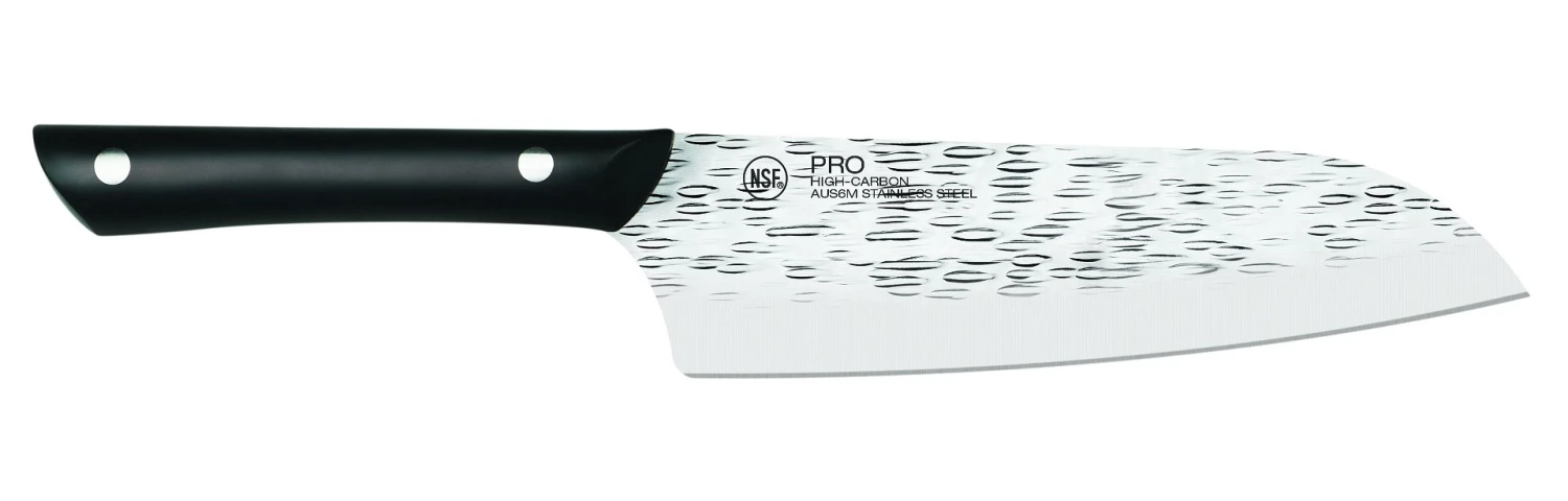NSF-certified for use in commercial kitchens, Kai PRO knives are made of Japanese AUS6M high-carbon stainless steel and hand sharpened to a 16° edge on each side. Full-tang with a double-riveted handle, the PRO series knives are built to stand up to daily, professional use. The striking hammered blade finish is beautiful, but even more; it reduces drag and helps food release from the blade easily. With a limited lifetime warranty, you can count on the precision performance this Kai PRO knife will bring to your prep work.