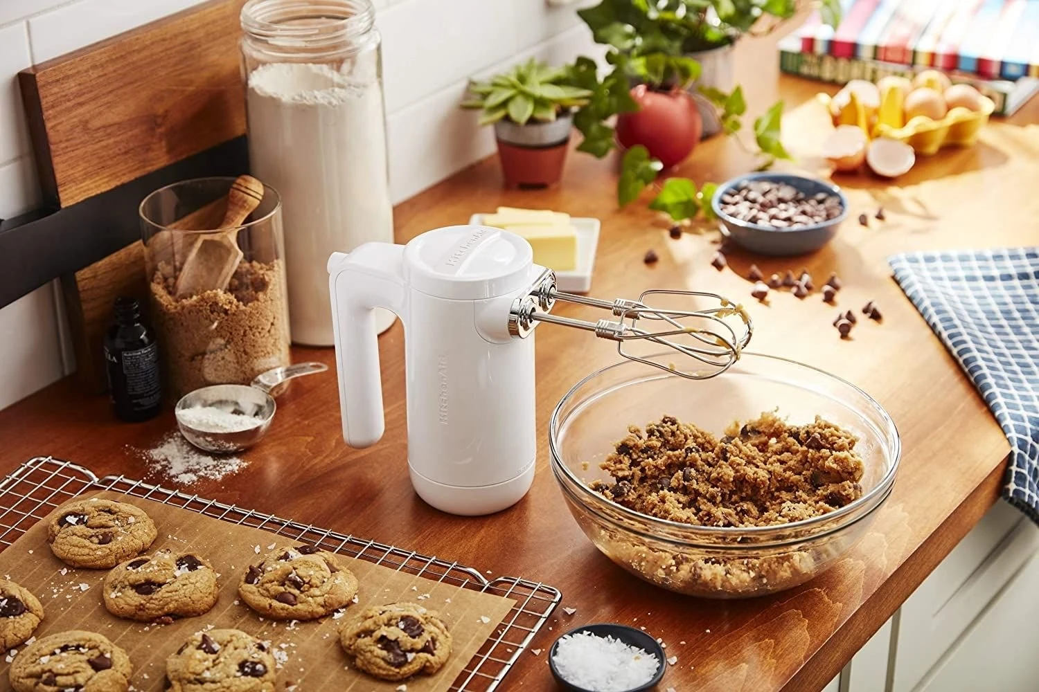 Mix up cake batter — without fussing with a cord — with the KitchenAid Cordless 7-Speed Hand Mixer in White! This mixer has all the power you need (and expect to find in a KitchenAid appliance), but it operates on a rechargeable battery. Move freely about your kitchen without being tied to an outlet. The powerful battery will ensure it incorporates ingredients as well as any corded hand mixer. And, you can make 4 big batches of chocolate chip cookies on a full charge. When it’s time to recharge, it takes just 2 hours or less for the battery to charge from empty to full. Quit wrangling cords in the kitchen and get the Cordless Hand Mixer!
