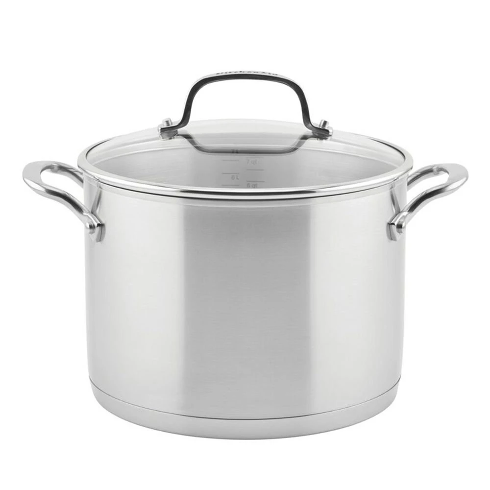 Constructed from high-quality 18/10 stainless steel, the 3-Ply Base 8Qt Stockpot from KitchenAid has a thick layer of heat-conducting aluminum sandwiched between two layers of stainless steel in the base for excellent edge-to-edge heat conductivity. Quickly brown meat or cook vegetables on your way to making a rich stew or hearty chili on any stovetop, including induction. Volume measurements etched inside the pot make it easy to measure ingredients, while both the pan and tempered-glass lid are dishwasher-safe to simplify cleanup and care. The stockpot is oven-safe to 500ºF without the lid (350ºF with lid) making this pan as versatile as it is durable for everyday kitchen use.