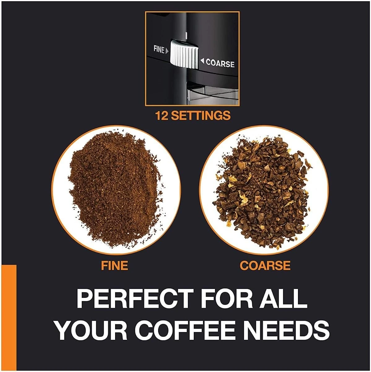 - 12 grind fineness settings plus intermediary settings, from fine to coarse
