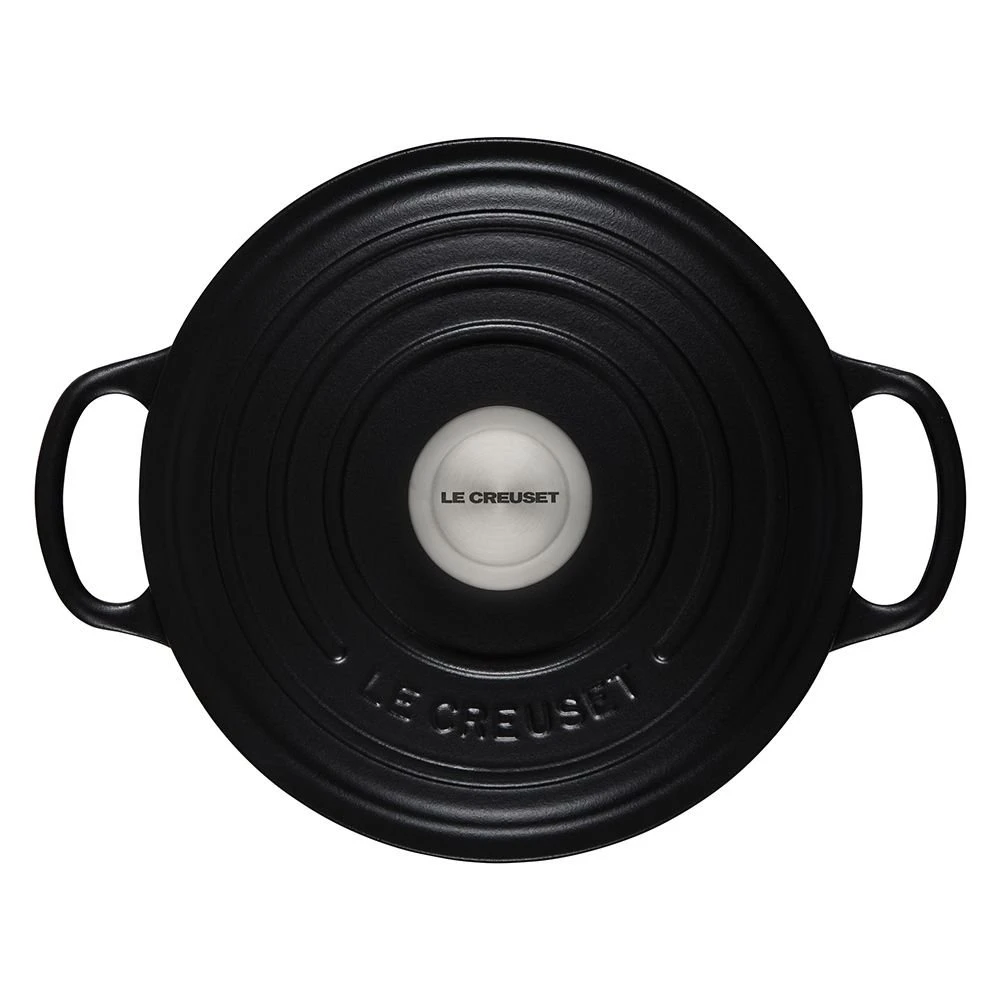 Surprise the whole family with a hearty roast made tender in Le Creuset’s moisture-retaining 3.5-Quart Round Dutch Oven in Licorice from the Signature Series. This beautiful round Dutch oven stands out with its beautiful chip-resistant enamel that lets you enjoy its beauty and quality for years to come. The modern textured design & sleek sophisticated matte black finish coordinates well with other Le Creuset cookware pieces in the Licorice Collection or mix & match with any other Le Creuset color collection for a bold look.