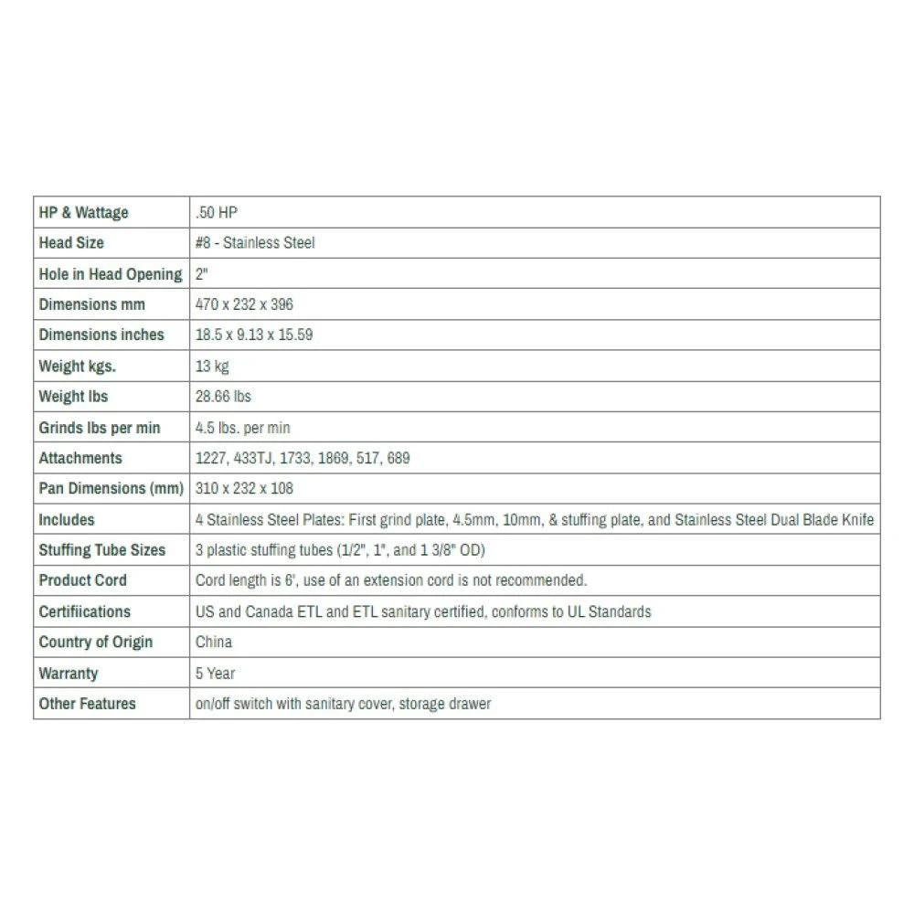 - Stainless steel motor housing base, storage drawer, grinder head, augur, plates, dual blade knife, augur puller & meat pan