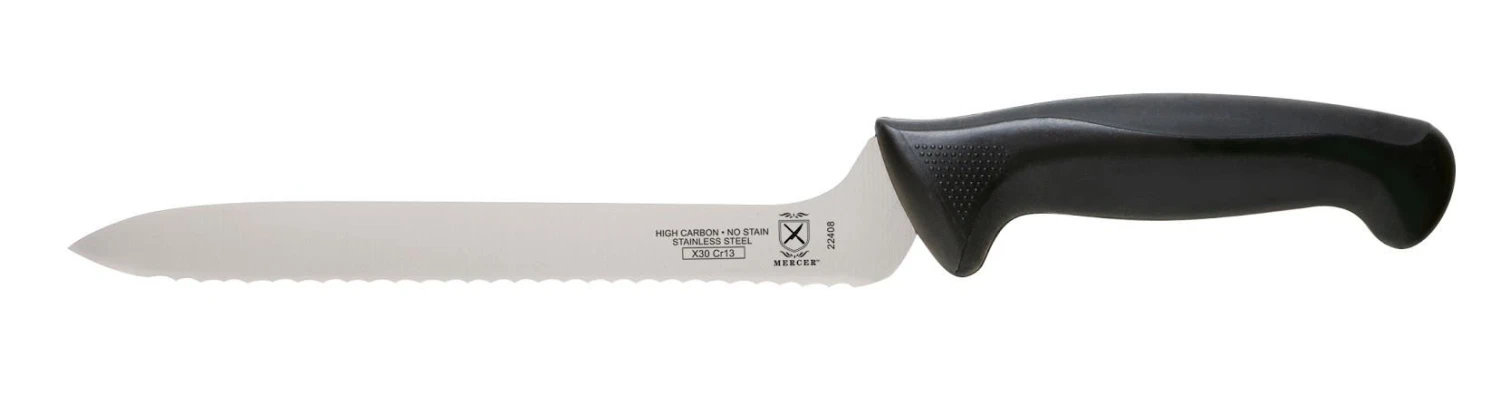 Evenly slice fresh baked breads with Mercer’s Millenniaâ„¢ 8″ Commercial Bread Knife with an Offset Blade and Wavy Edge. The ergonomic handle is designed with Santoprene for comfort and polypropylene for durability. Millenia blades are designed with one piece of high carbon stainless steel, razor-sharp edges, and textured fingers for an innovative design to meet the demands of today’s professional chefs. Â Mercer’s Milleniaâ„¢ 8″ Commercial Bread Knife includes an offset blade that allows it to cut straight down to the cutting board, leaving no crust behind!