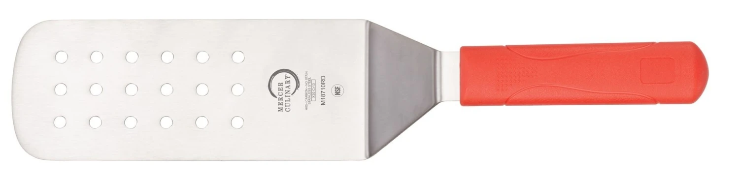 Flip large quantities of hamburger, bacon, and grilled cheese with Mercer’s Millennia™ Perforated Turners! These turners are crafted with precision-ground stainless steel for a mix of flexibility and stiffness while meeting the sanitation needs of a professional kitchen. The handles are designed with molded polypropylene handles for an extra-sure grip and enhanced safety. This product features a perforated head, which is ideal for serving foods with excessive sauce or grease. Mercer’s Millennia™ Commercial Perforated Turner with is perfect for professional kitchens or busy homes looking for a durable product. To avoid cross-contamination, simply selected multiple colors for designated foods!
