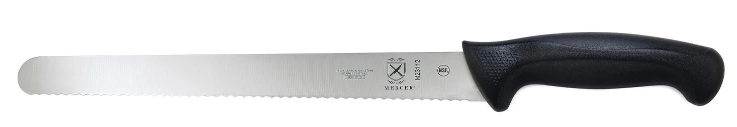 Feel the crispy crust of your bread crumble beneath the blade as you glide easily through the crust with Mercer’s 12” Serrated Slicing Knife / Bread Knife. This serrated bread knife is designed to easily penetrate hard crusts or tough skins without crushing the soft insides of foods such as break, sausages or tomatoes.