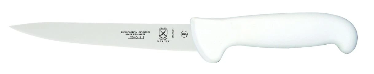 Your kitchen is extremely busy and you need knives you can count on when the heat is on. Mercer Ultimate White collection is NSF Certified and constructed from razor sharp, high carbon, stain-free Japanese steel. The ergonomic handle is made of polypropylene for durability while the protective finger guard makes certain fingers stay off the back edge of the knife and the textured finger points ensure slip resistance and better grip, keeping you and your staff safe from accidents. The hollow ground edge makes for easy maintenance and rapid sharpening for the busiest of kitchens. When your kitchen demands the best cutlery, you can count on the Mercer Ultimate White 7” Fillet Knife to get the job done, safely and efficiently!
