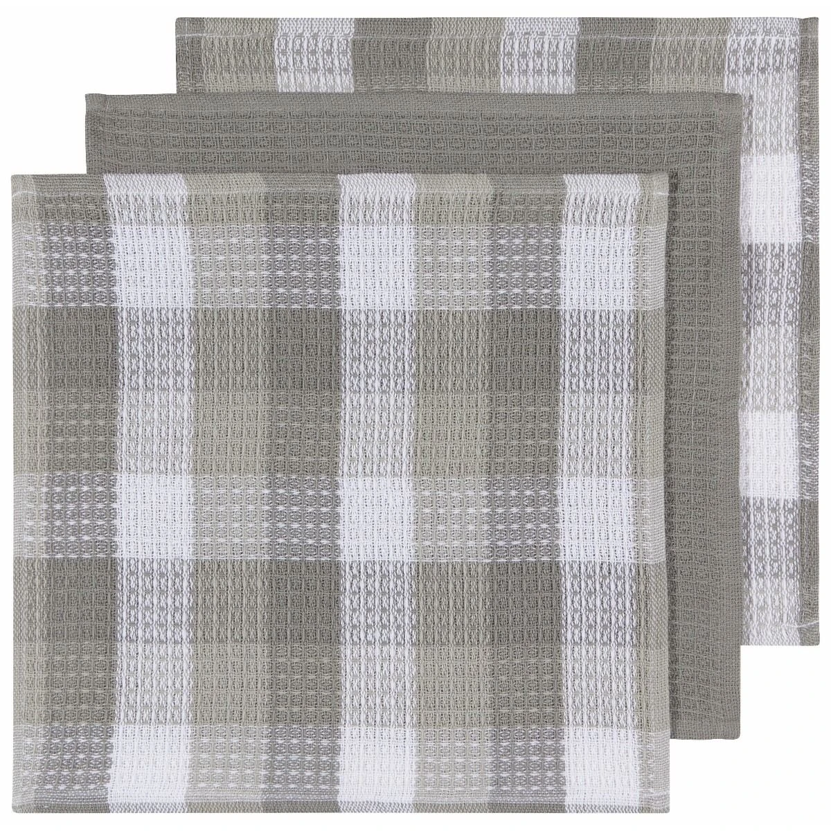 - Includes three waffle-weave dishcloths in classic neutral tones of gray, taupe & white