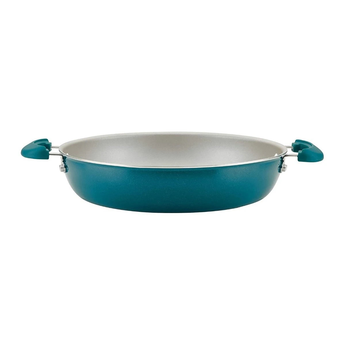 The Rachael Ray 8-Piece Enameled Stacking Cookware Set in Teal Shimmer brings the effortless maintenance of nonstick cookware while providing the convenience of stackable storage to save you precious pantry space! This set includes essential family-sized cookware pieces that are designed for cooking one-pot meals. Each piece is crafted of durable aluminum and finished with a reinforced PlatinumShield Technology nonstick coating that’s 9 times harder than titanium for incredible long-lasting durability and effortless food release that’ll require less oil while cooking and make cleanup a breeze. The flared rims provide mess-free pouring while the shatter-resistant glass lids lock in moisture and flavors. With induction compatible bases and double-riveted stainless steel handles with heat-resistant silicone sleeves, these cookware pieces are oven-safe up to 400°F for a seamless transition from the stovetop to the oven. When you’re done cooking, the pieces cleverly stack to save 55% more cabinet space! Along with the cookware pieces, this set also includes two of Rachael Ray’s Lazy Tools that are designed with a unique slot for resting on the cookware rims so they’re right in reach while preparing your favorite dishes. For a dynamic set of nonstick cookware that’ll keep your cabinets clutter-free, try the Rachael Ray 8-Piece Enameled Stacking Cookware Set!