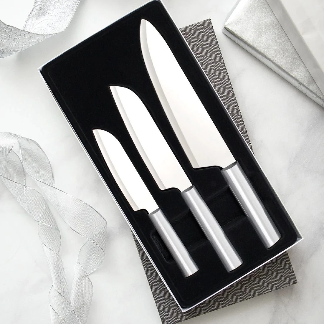 • Sleek, modern set of large kitchen knives in an attractive gift box