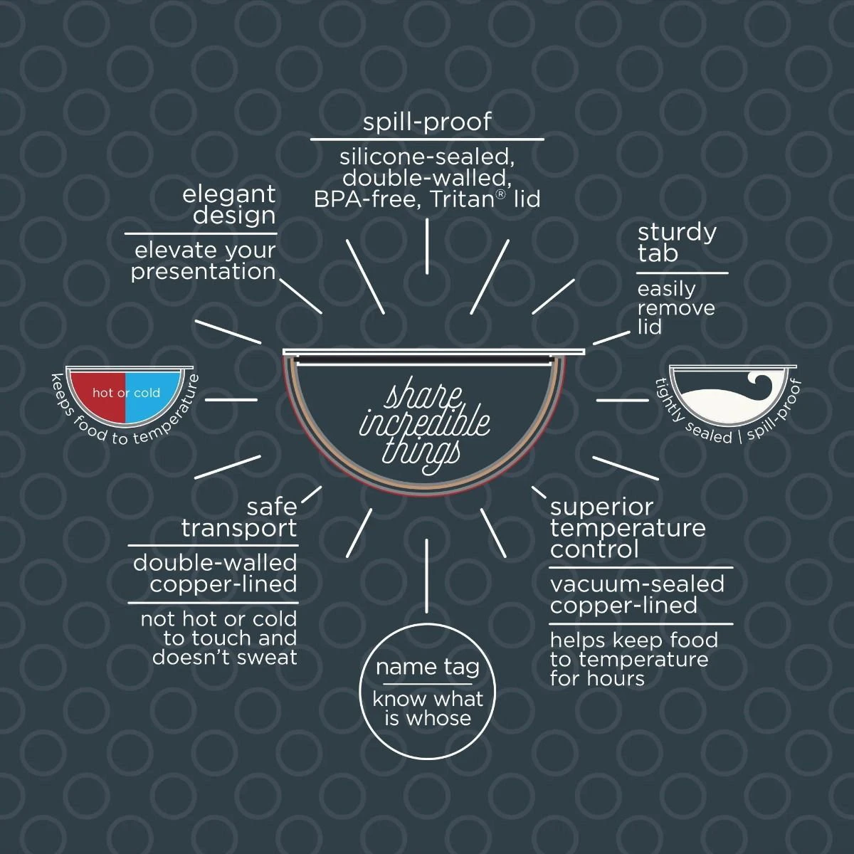 Ensure foods stay fresh as can be when serving up your family favorite recipes at potlucks, family picnics, or holiday meals with the Served 0.625 Quart Small Serving Bowl (Caviar)! Featuring a durable double-wall stainless steel construction with a copper lining and sleek matte finish, this serving bowl keeps foods piping hot or icy cold while serving – letting everyone enjoy foods at the optimal temperature while allowing for an attractive table setting. The BPA-free Tritan lid includes an airtight silicone seal to prevent leaks during transport, while the sturdy tab lets you effortlessly remove it without splashes or spills. Offering a 0.625 Quart capacity and finished in a deep, smoky Caviar finish, the Served Small Serving Bowl will make a welcomed addition to your dinner table during any event.