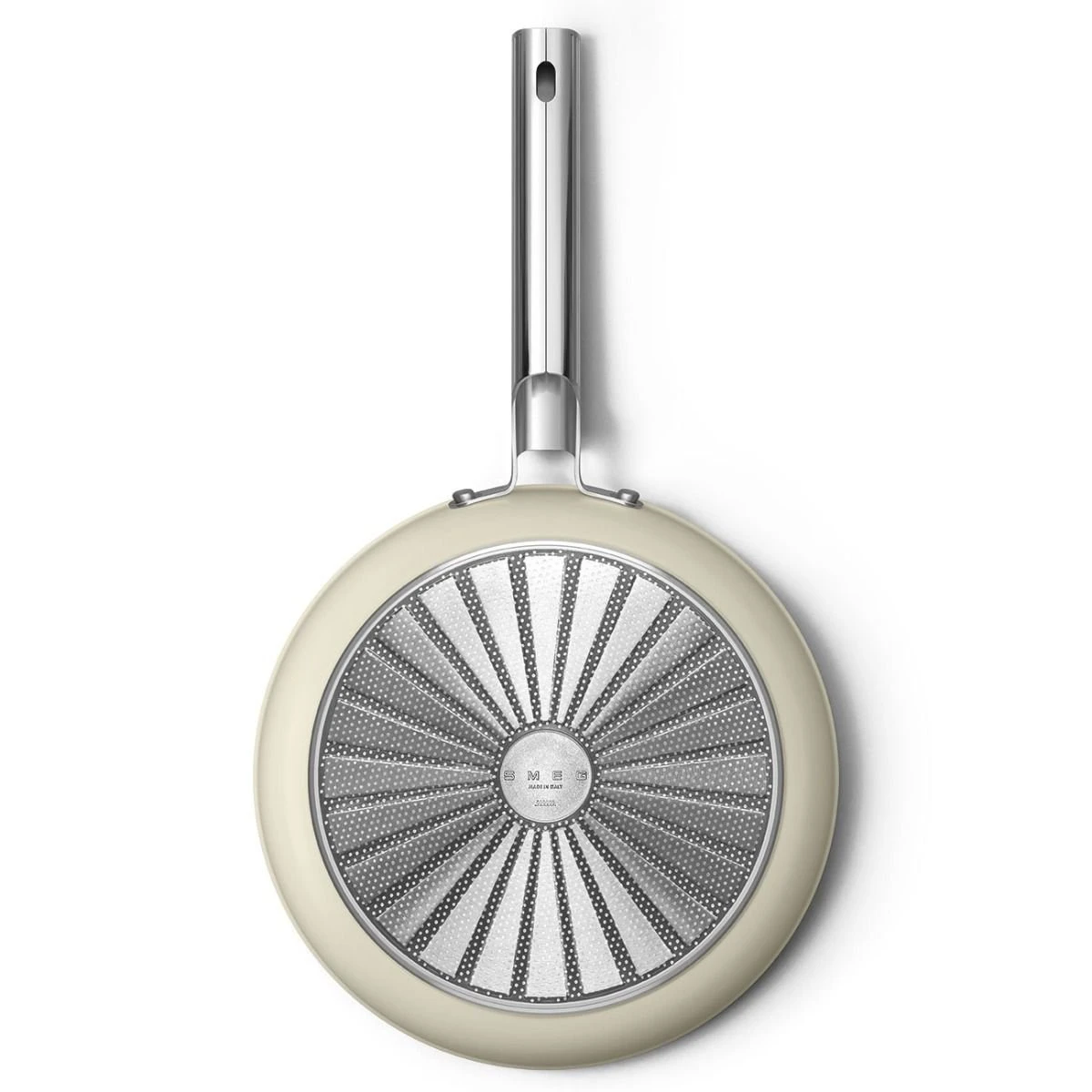 Fry all your breakfast meals and meats with the new SMEG 11” Frying Pan in Cream! Designed by Italian firm Deepdesign, this frying pan has a cold-forged aluminum base with a stainless steel handle and bottom plate, making for a sturdy nostalgic design that meets contemporary application for it to be the prominent kitchen pan. From making omelets to skillet meals and frying burgers to small steaks, cooking in its nonstick Teflon coating allows swift release to cooked foods, makes cleaning less of a chore, and reduces how much cooking oil you would typically use. You may even use this pan to make delicious red or white sauces for any type of pasta or to make excellent vegetable stir-fries! This fry pan can be used on all types of stoves, including induction, and is also heat resistant up to 480°F, meaning it will handle serious heat emitting from the stove top and dishwasher use time and time again. With its capabilities and two-year warranty, you cannot ask for more ease and convenience when using the SMEG 11” Frying Pan in Cream!