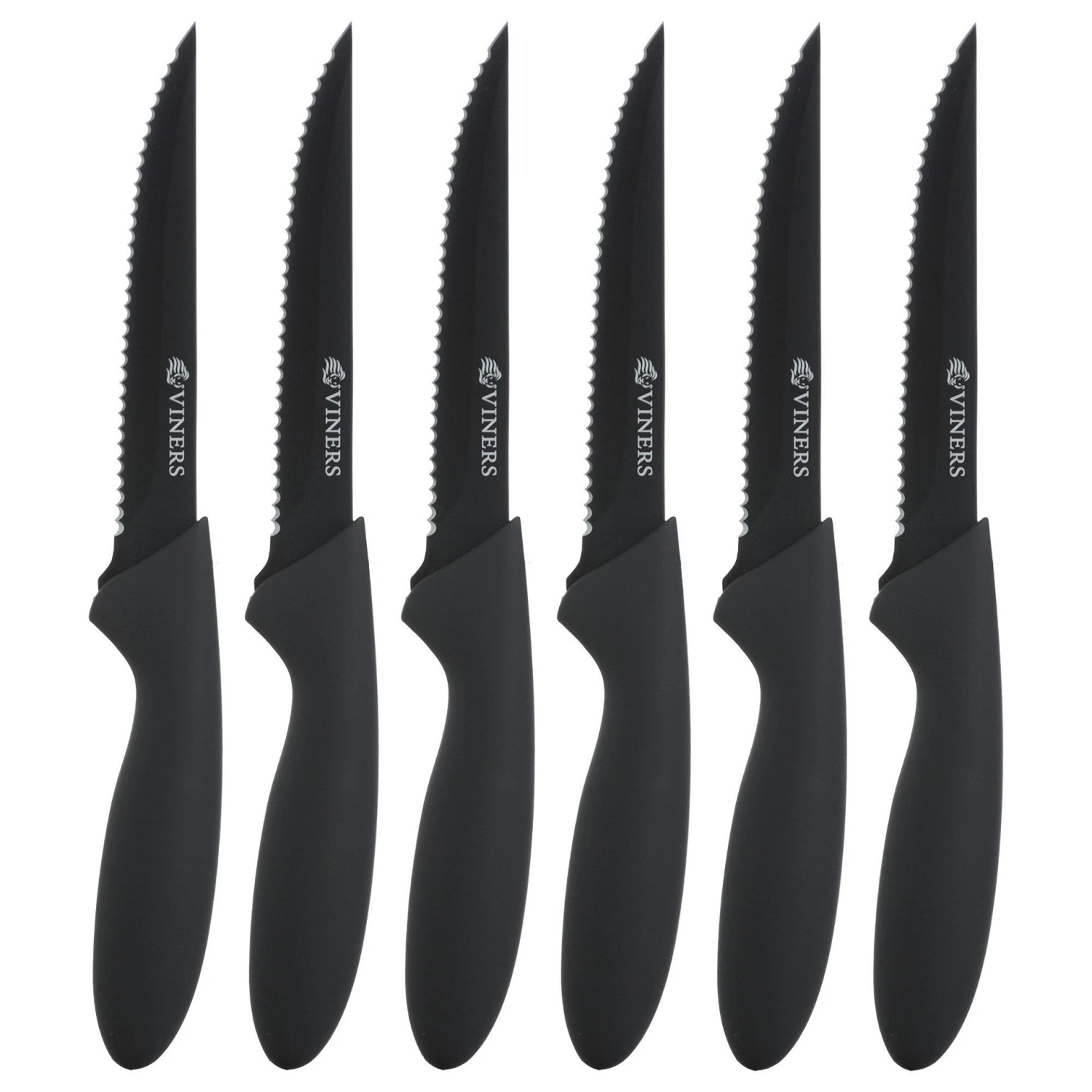 Slice through tender steak and meat effortlessly with the Viners Everyday Steak Knives Set! This sleek set includes 6 knives that are crafted from durable, high-quality stainless steel and finished with a black nonstick coating for a smooth cut every time. Plus, each knife has a serrated blade and a curved, soft-grip handle for comfort and control. For a sophisticated set of steak knives, try the Everyday Steak Knives Set by Viners today!