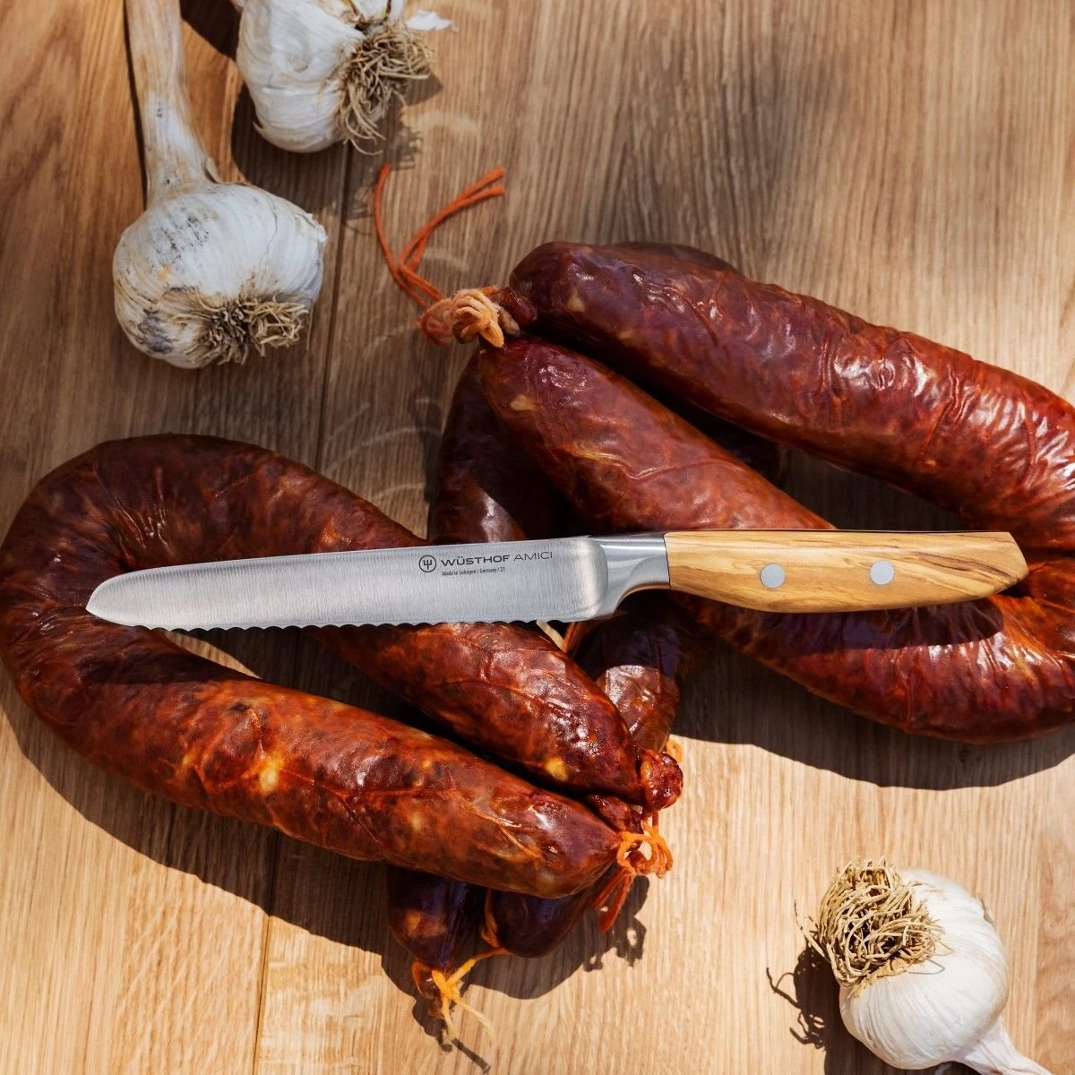 Beside your chef knife should be the utility knife, known for taking care of the smaller food items in your meal preparation at home. In choosing the ideal knife, consider the Amici Collection by Wusthof. The Wusthof Amici 5″ Serrated Utility Knife is forged from a piece of German steel and with a Rockwell Hardness of 58HRC, giving it the intuition and agility you’ve always dreamed of in superb knife design. Pulling all the stops, this knife is set with a full bolster to protect your fingers as you hone in on true control with every slice. The handles of each knife in this series feature Calabrian olive wood handles, naturally water-resistant and antibacterial, tailored to an enunciated fluidity that will fit into the grip of your hand. With its serrated edge, take care of tomatoes or other soft-to-thick skinned produce, aged cheeses, summer sausage, and smaller portions of bread effectively. When your job as a chef is complete, be sure to wash this knife by hand and dry it immediately for the utmost care. As you pick it up again, please hone your knife to retain its impeccable edge so that every chop is meaningful. Life is sweet, and your knife should emulate that enrichment. Get the Wusthof Amici 5″ Serrated Utility Knife today.